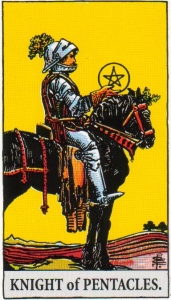 Symbols - The knight rides a slow heavy horse. He wears full armor and holds a pentacle in his right hand as he surveys the country-side.
